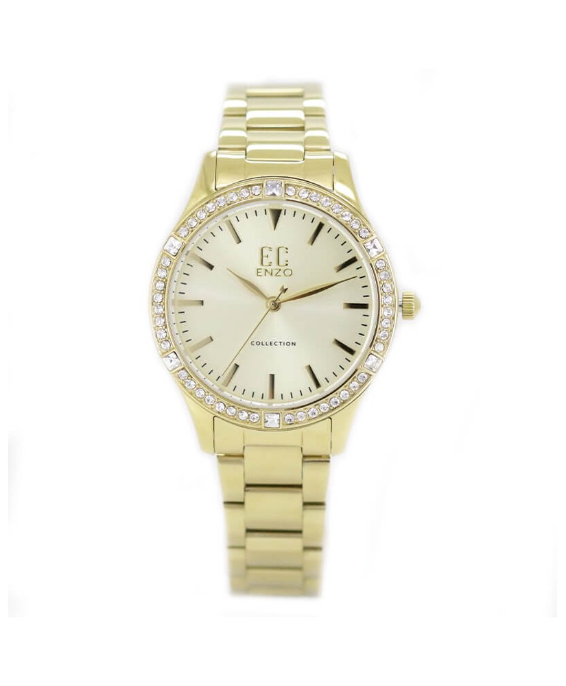 Notre montre Enzo collection de référence EC3434-G pour Femmes, Conçue avec un boîtier en acier inoxydable du couleur doré du diamètre 33 mm, un bracelet en acier inoxydable du couleur doré et un cadran doré. La montre est livrée avec son coffret, son sac et son certificat de garantie Enzo collection d'une durée de 2 ans.