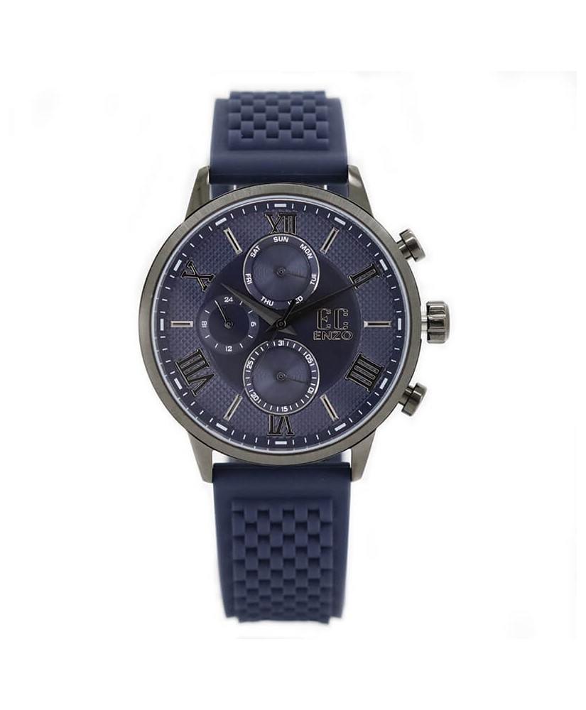 Notre montre Enzo Collection de référence EC2258-D pour Hommes, Conçue avec un boîtier en acier inoxydable du couleur gris charbon du diamètre 45 mm, un bracelet en SILICONE du couleur bleu et un cadran bleu. La montre est livrée avec son coffret, son sac et son certificat de garantie Enzo Collection d'une durée de 2 ans.